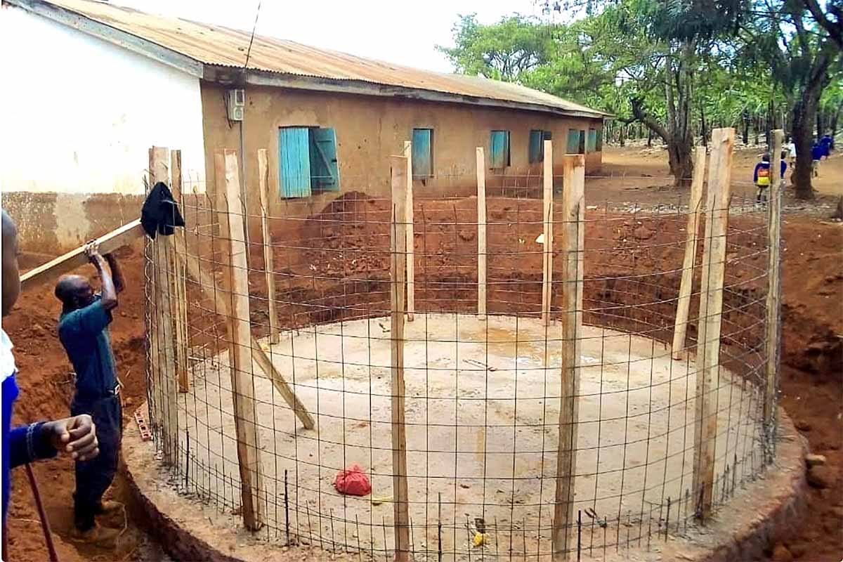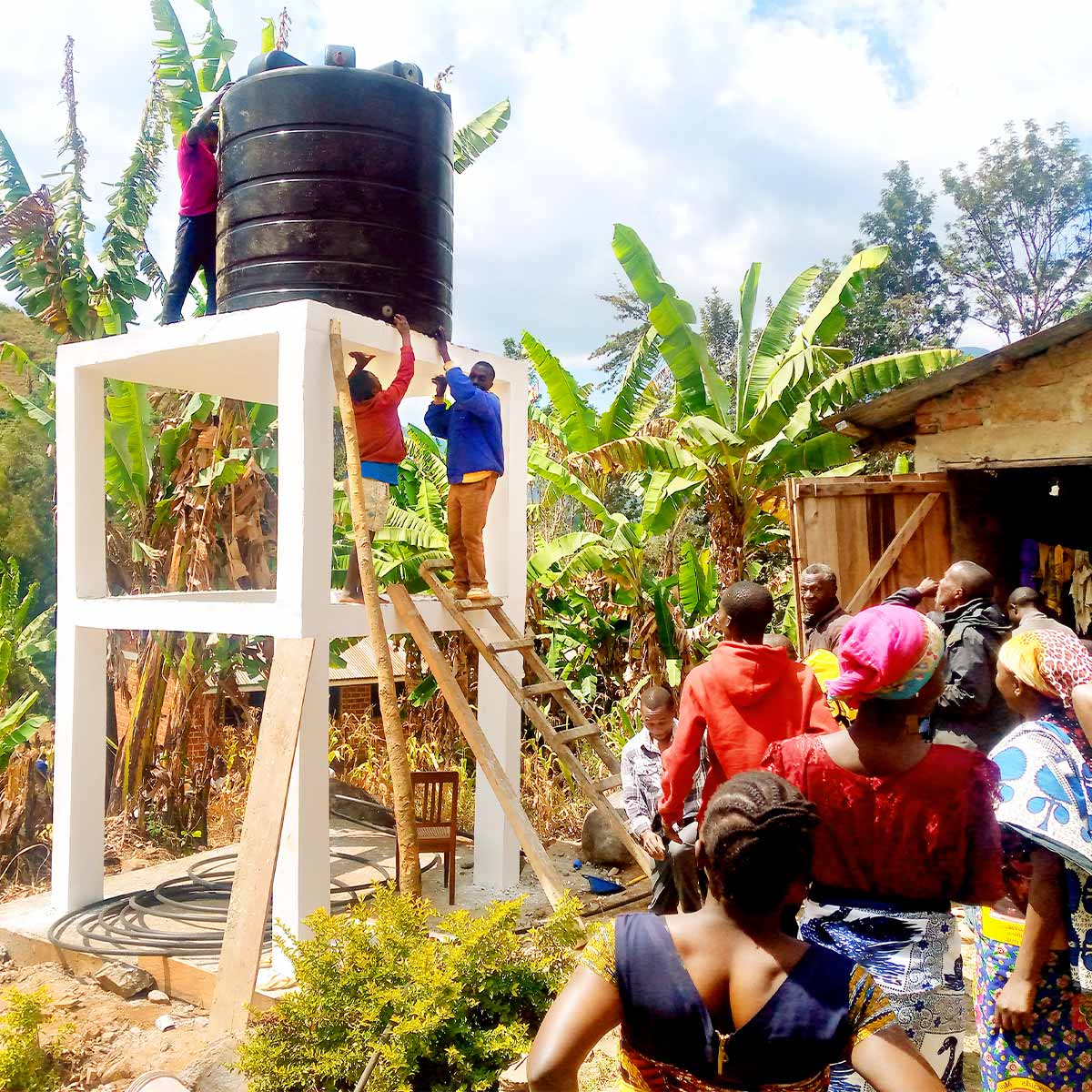 Auch in Bunduki kommt erstmals Trinkwasser aus der Leitung. Die Bewohnerinnen des Ortes haben mithilfe von Sei So Frei eine Wasserleitung installiert und eine Zisterne gebaut. Eine nahe gelegene Quelle war der Ausgangspunkt für die neue Wasserleitung. Darüber hinaus hat die Dorfgemeinschaft zusammengeholfen, um mithilfe von Sei So Frei eine Zisterne zu errichten. Das weiße Gerüst, das den großen Tank trägt, ist von Weitem zu sehen und lebendiger Treffpunkt der Gemeinde. Am Sonntag kommen viele Menschen mit schweren Lasten von weit her, um den Gottesdienst zu besuchen und ihre Waren am Markt zu verkaufen. Ihren Durst nach dem langen Weg stillen die Menschen jetzt mit Wasser aus der Leitung.