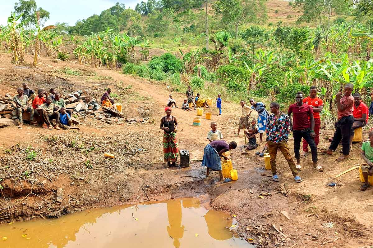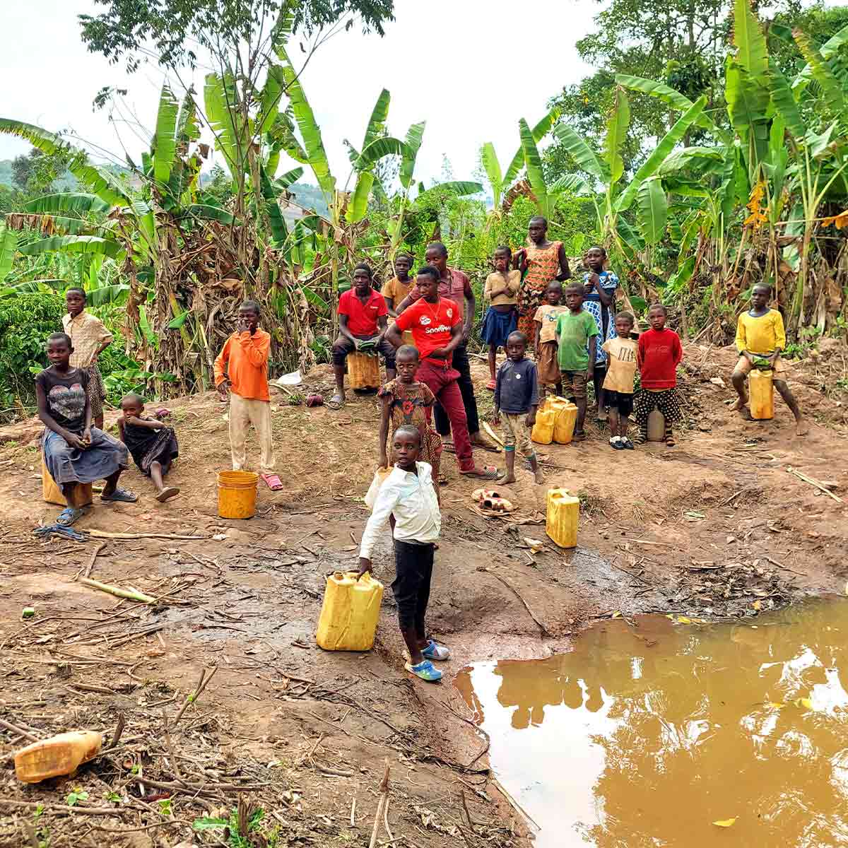 Für Kyerunga sammeln wir für eine Quellfassung, Handpumpe und eine zusätzliche Zisterne, um die Trockenperioden überbrücken zu können. Die 27 Jahre alte Zisterne in dem abgelegenen Ort ist voll funktionsfähig, aber reicht bei weitem nicht aus, um genug Regen zu fassen. Man will vorbereitet sein, alle warten auf Regen. Jetzt füllen die 700 Dorfbewohner täglich ihre Kanister an einem kleinen, weit entferntem Wasserloch in den steilen Hügeln. Sie streichen über die Wasseroberflläche, um groben Schmutz zu entfernen. Mit Kochbananen verschließen sie ihre Behälter und tragen sie teils stundenlang nach Hause. Ein Brunnen kann hier nicht gebohrt werden. Es braucht eine zweite Zisterne und eine Quellfassung mit Handpumpe für das Wasserloch. Sei So Frei sammelt aktuell dafür, dass dieses Projekt umgesetzt werden kann.
