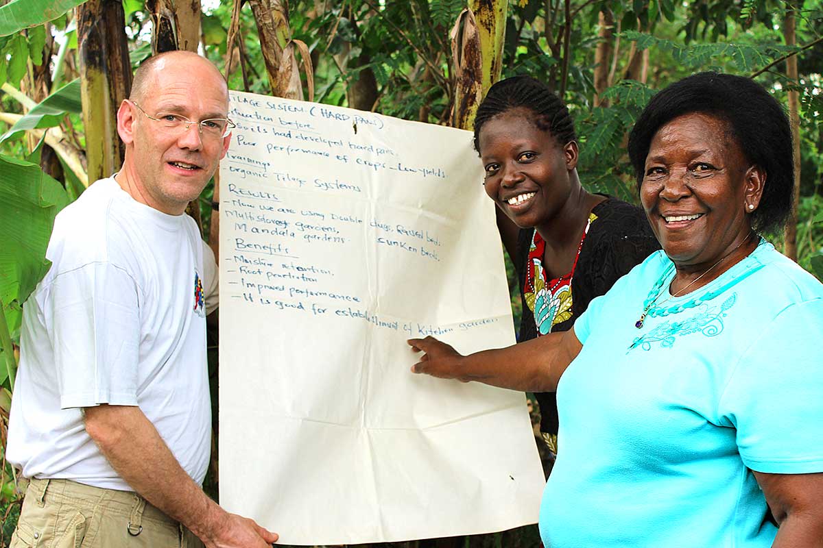 „Bis vor wenigen Jahren haben wir ausschließlich teure chemische Pflanzenschutzmittel verwendet. Es kam dadurch zu einer Zunahme von Krebs und anderen Erkrankungen, der Boden war ruiniert, wir konnten nichts mehr ernten und mussten hungern. Dann haben wir in den Trainings von DESECE gelernt, wie wir rein biologische Pflanzenschutzmittel herstellen können. Diese haben sich als äußerst effektiv erwiesen. Außerdem arbeiten wir jetzt alle zusammen, dadurch sind wir wesentlich schneller und es gibt auch keine Konflikte zwischen den Ethnien mehr“, erzählt Moses, Vater von neun Kindern, bei unserem letzten Besuch. Er und gut 1.000 andere Kleinstbauern in 90 Gemeinden lernen in Gruppen durch die Ausbildungen von DESECE biologische Landwirtschaft, das Anlegen von Waldgärten auf mehreren Ebenen, den Umgang mit verschiedenen Pflanzen, aber auch Grundlagen des Verkaufs der Ernte auf Märkten. Zipporah, Vize-Sekretärin der Organic Farmer Group, hat selbst fünf Kinder, dazu zwei Adoptivkinder. Sie schildert den großen Unterschied für ihr Leben: „Wir haben jetzt genug zu essen, ernähren uns gesund und haben viel mehr Handlungsspielraum. Wir sind arm, aber es geht uns besser und wir hoffen, dass wir in fünf Jahren der Armut entkommen sind.“ Ihre Kollegin Josephine holt noch weiter aus: „Die Schulungen machen auch einen großen Unterschied in unserem Sozialleben. Ich wurde selbst ausgebildet und gebe mein Wissen nun als Trainerin weiter. Wir versuchen die Frauen aufzuklären, zu thematisieren, dass der Kinderreichtum ein Problem für die Ernährungssicherheit ist und sprechen über Familienplanung.“ In Gruppen wie jener von Josephine lernt die Dorfbevölkerung viel über Gleichstellung und Menschenrechte – zum Beispiel auch, dass es Mediatorinnen für Konfliktfälle gibt. Und dass es selbst für Kleinstbauern die Möglichkeit eines Rechtsbeistands und etwas finanzielle Unterstützung gibt. So wird Wissen viral weitergetragen und ermöglicht eindrucksvolle soziale Entwicklungen in den Dörfern.