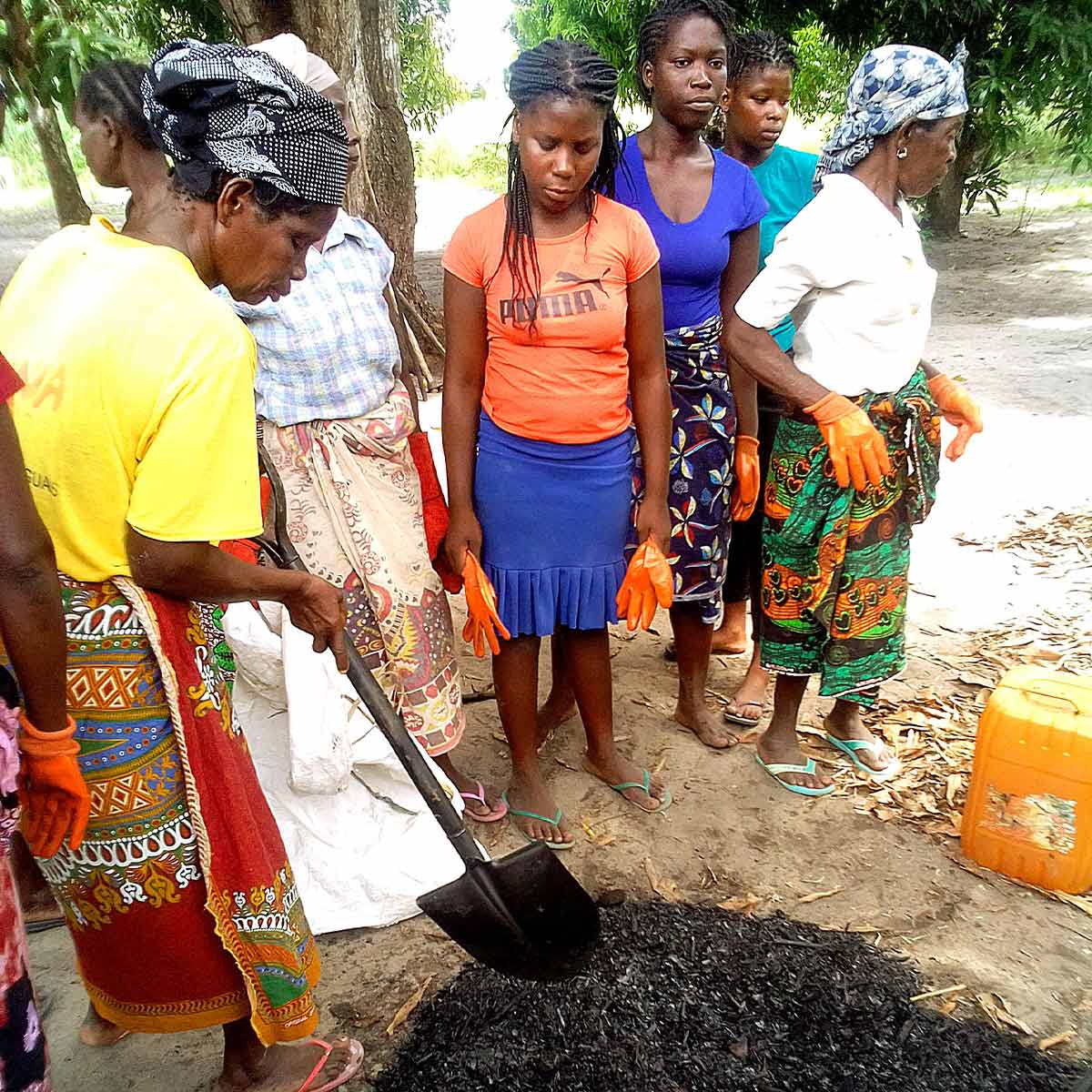 In Mosambik sind 60 % des Abfalls organisch und und können somit für Kompostierung und Aufbereitung als Dünger verwendet werden. Besonders in den ländlichen Gebieten, wo wir arbeiten, hilft das, Einkommen und Nahrung für arme Kleinbauernfamilien zu schaffen. Die eigenen kleinen Beete der Familien können damit gedüngt werden und Reis, Gemüse oder Obst wachsen besser. Der Bio-Abfall wird kompostiert oder mittels Feuer zu Bio-Kohle verarbeitet. Das bringt bares Geld. Bereits 206 Familien haben gelernt, Biomüll zu sammeln, zu verarbeiten und zu verkaufen. Wolfgang Heindl von Sei So Frei konnte sich im Herbst 2023 vor Ort ein Bild davon machen und ist begeistert. „Die Familien verstehen sehr schnell, was für eine unschätzbare Ressource der verhasste Müll sein kann. Sie lernen, damit umzugehen und sich so ein Einkommen zu schaffen“.