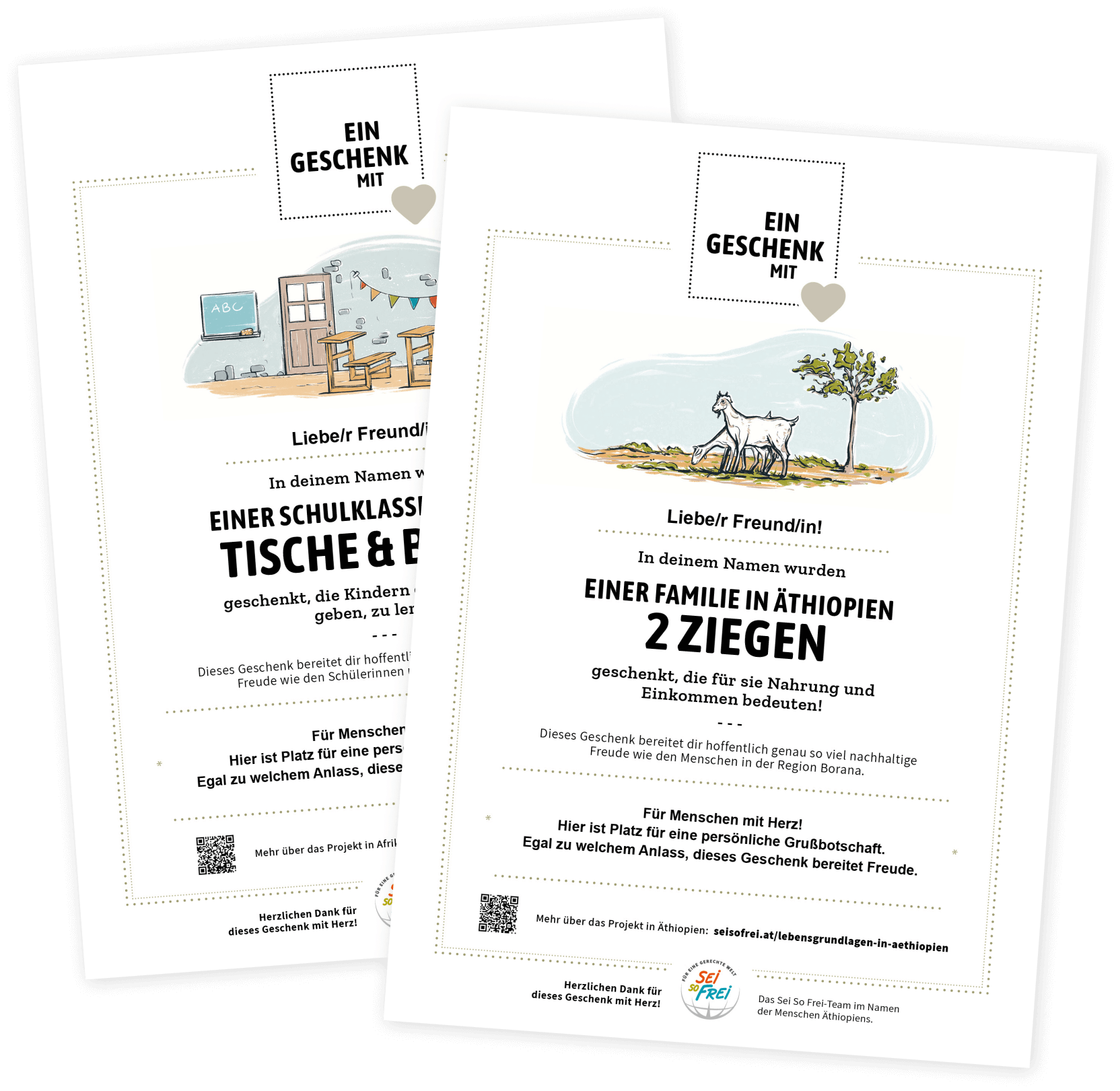 Gutes Tun und Weiterschenken. Schenken Sie Menschen in unseren Projekten zwei Ziegen, Schulbänke, oder Bäume. Kleine Beträge bei uns haben enorme Wirkung dort! Widmen Sie diese Spende Ihren Lieben und überreichen Sie die gute Tat in Form einer personalisierten Geschenkurkunde. Denn „mit Herz“ bedeutet von Herzen. Und das sind unsere Geschenke in vielerlei Hinsicht.